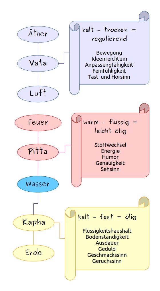 Das Geist-Körper-Konzept des Maharishi Ayurveda umfasst auf der energetischen und regulativen Ebene drei Komponenten Vata, Pitta, Kapha. Durch sie manifestiert sich die körperliche und geistige Natur des Menschen. Die vier Elemente - Luft, Feuer, Wasser und Erde - materielle und energetische Bausteinen des Lebens stehen mit dieser feinstofflichen Ebene in direktem Zusammenhang.